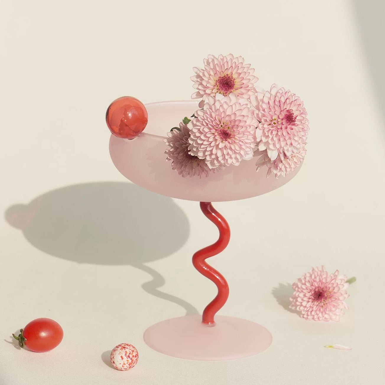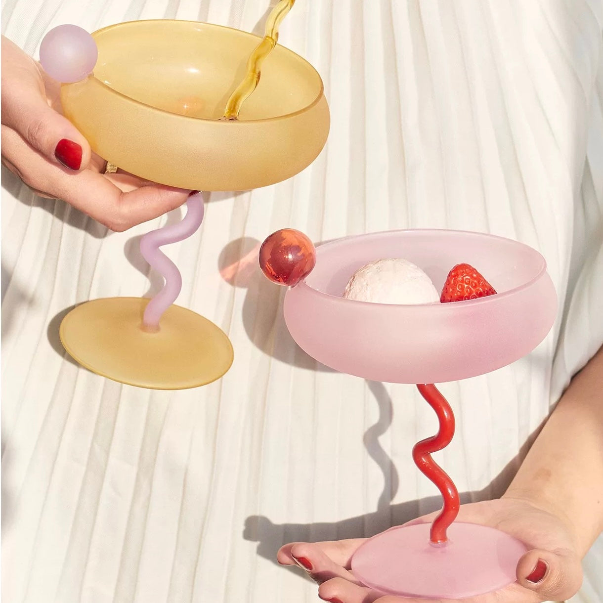 Brighten your cocktail ritual with the Solar Swirl Coupe, curated from Soremo. Each glass is mouth‑blown in two vibrant gradient finishes—sun‑washed yellow fading to lilac or rosy pink blending into coral—and supported by a playful, hand‑sculpted spiral stem topped with a contrasting glass sphere.